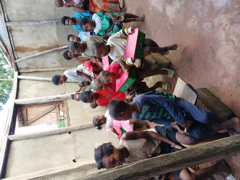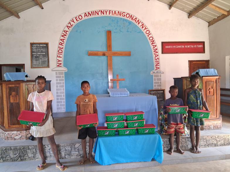 Distribution of gifts from Bethlehem to the children of the church. Boxes included crafts and supplies